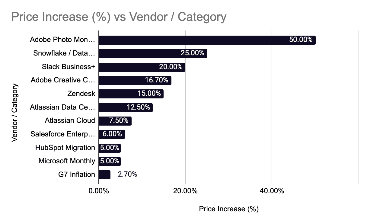 And that volatility has widened in 2025. SaaS pricing rose by an average of 11.4 percent across the industry, with some vendors increasing fees by more than 300 percent after acquisitions. This is not simply because the recent SaaS investments into AI need to be recouped; the average SaaS price increases 8-12% annually (source), which far outpaces average market inflation rates.