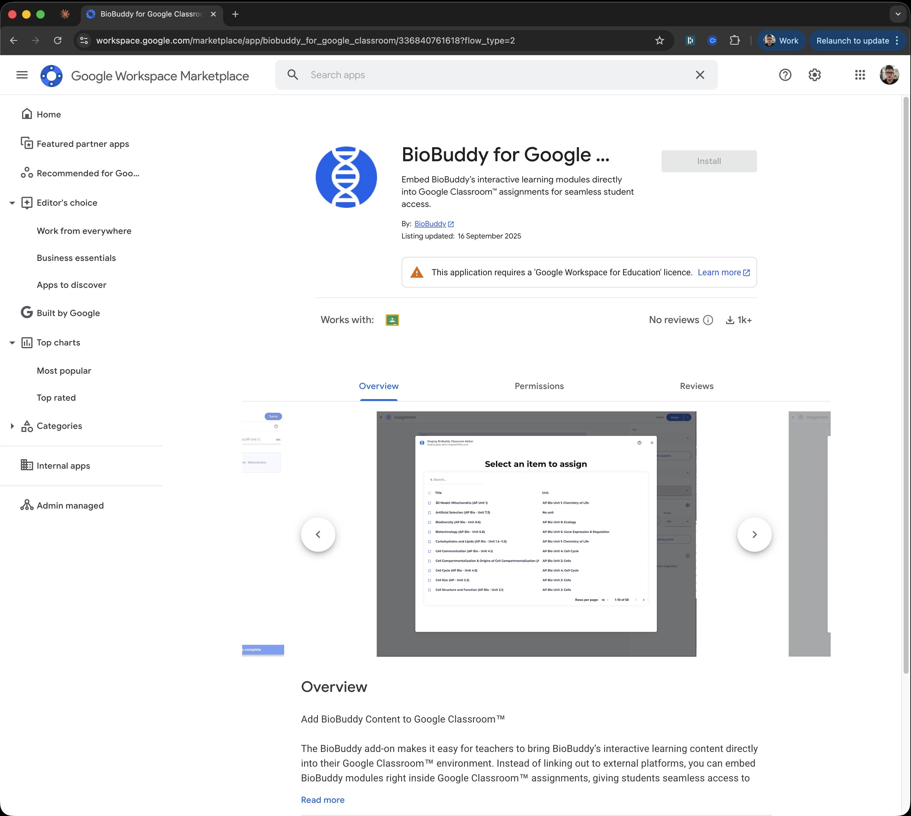 The integration empowers individual teachers to champion the product. A teacher could discover BioBuddy's content and, with a few clicks, begin using it with their students.
