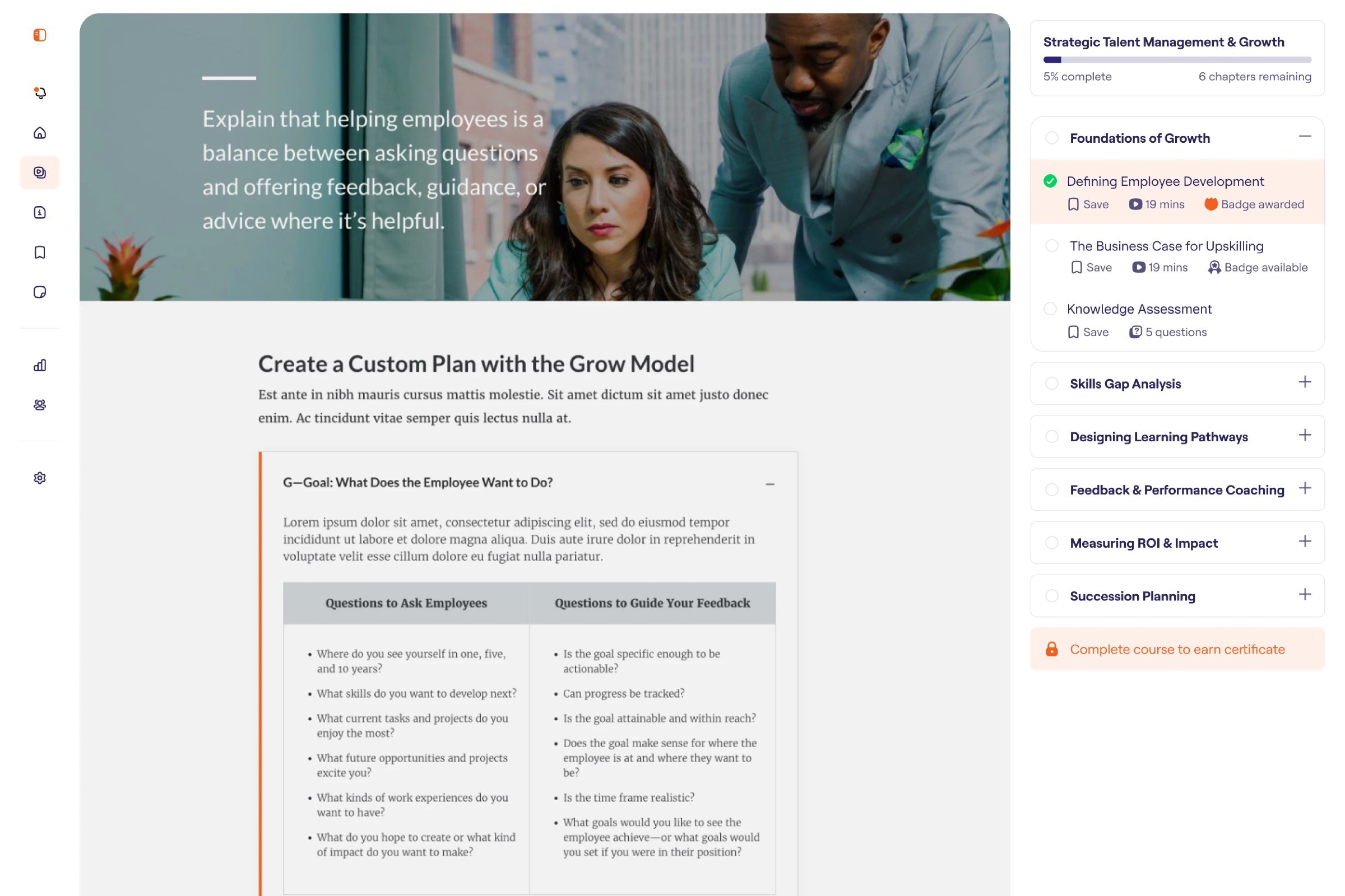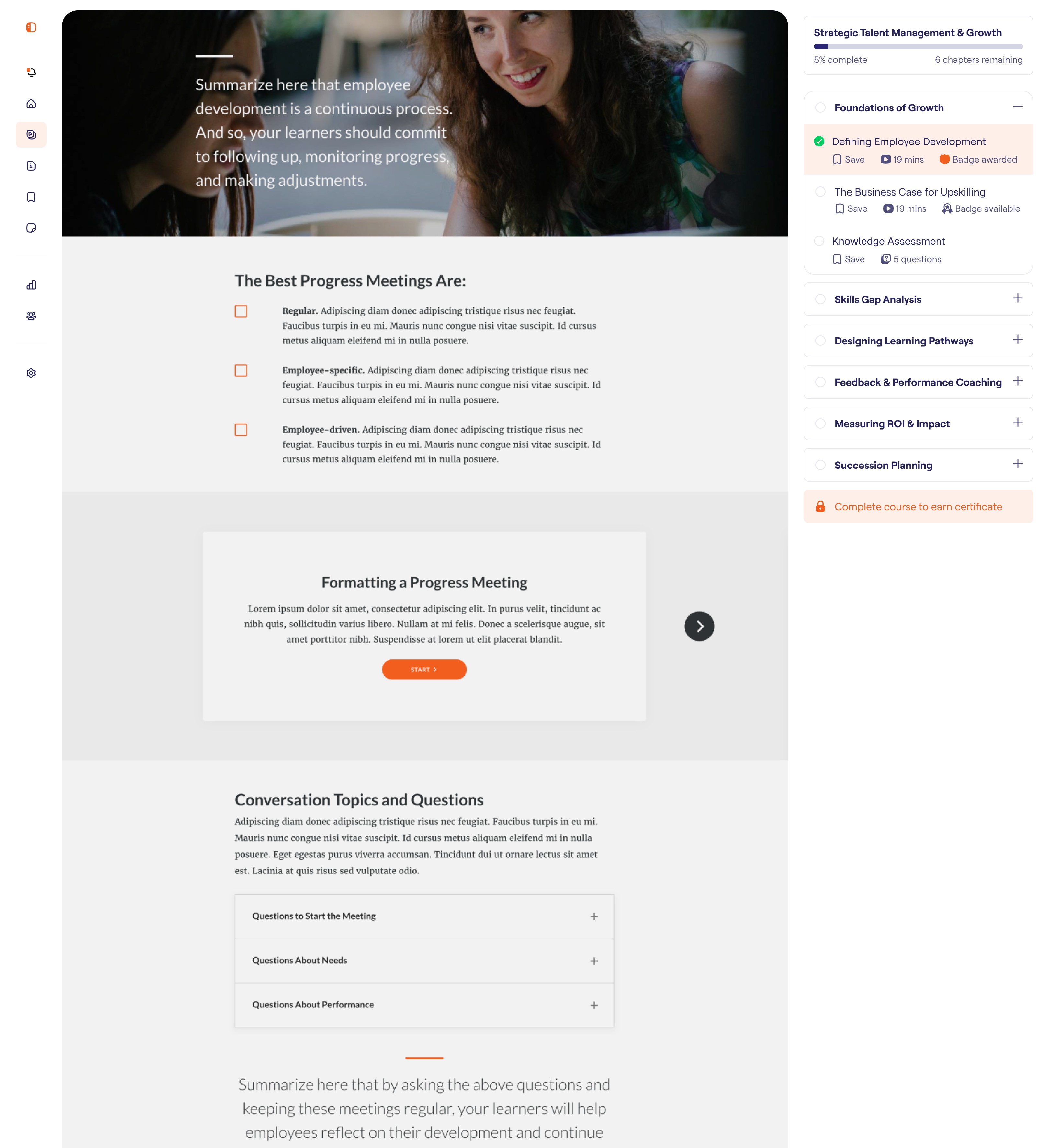 In the above example, a SCORM course built in Articulate Rise is embedded into the LMS and feels like a native part of the experience; complete with full progress tracking.